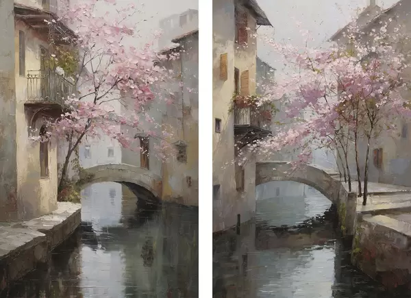 Plakatas romantiškas miesto peizažas su žydinčiu medžiu aliejaus tapybos stiliumi d01173