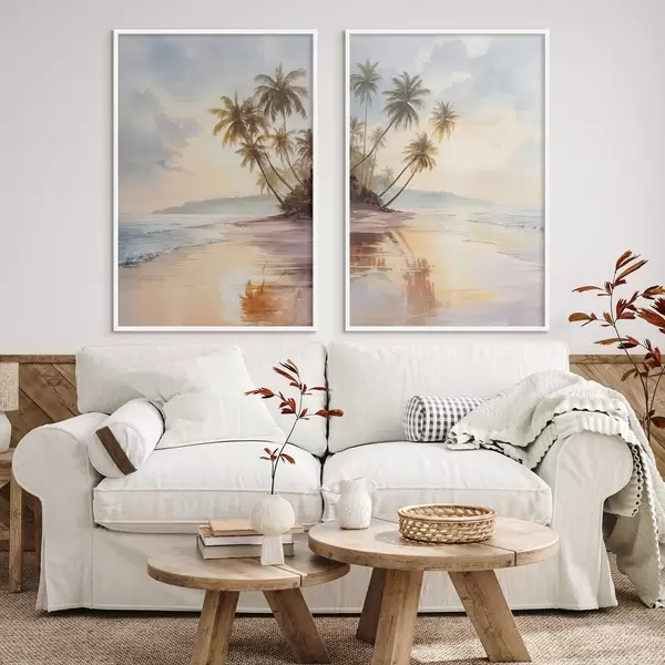 Plakatas akvarelės stiliaus saulėlydžio paplūdimys saloje Ne d01177