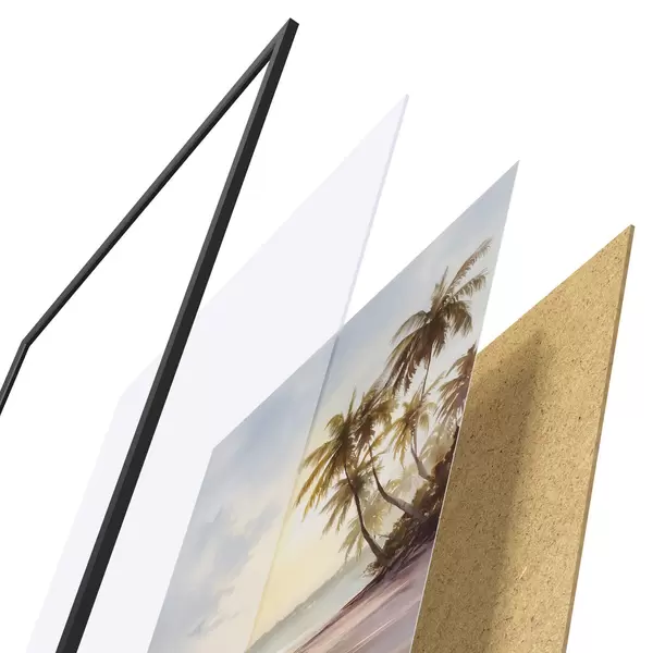 Plakatą sudaro rėmas, pleksiklas, atspausdintas vaizdas ir medžio drožlių plokštės pagrindas. Plakatą galima iš karto pakabinti ant sienos dėl kitoje pusėje esančių laikiklių.