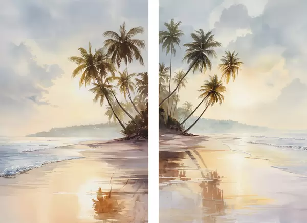 Plakatas akvarelės stiliaus saulėlydžio paplūdimys saloje Ne d01177