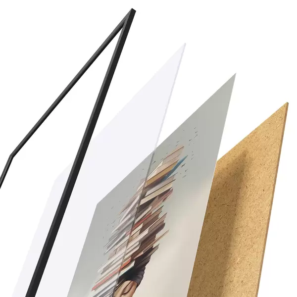 Plakatą sudaro rėmas, pleksiklas, atspausdintas vaizdas ir medžio drožlių plokštės pagrindas. Plakatą galima iš karto pakabinti ant sienos dėl kitoje pusėje esančių laikiklių.