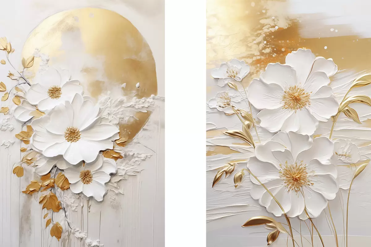 Plakatas Balta gėlė su geltonais akcentais ir subtiliais lapais ant tekstūruoto fono, šiuolaikinis menas d01233