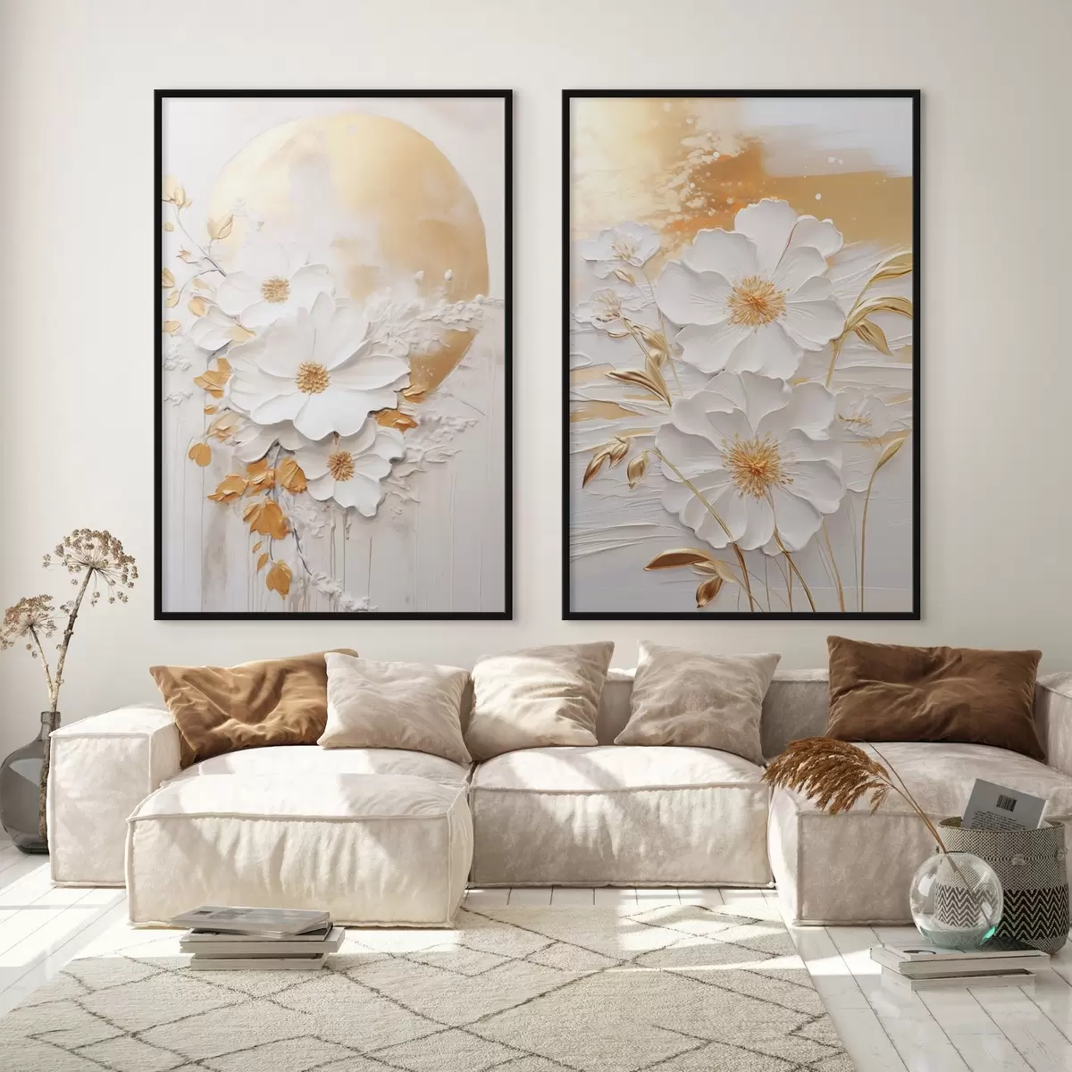 Plakatas Balta gėlė su geltonais akcentais ir subtiliais lapais ant tekstūruoto fono, šiuolaikinis menas Ne d01233