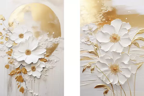 Plakatas Balta gėlė su geltonais akcentais ir subtiliais lapais ant tekstūruoto fono, šiuolaikinis menas Ne d01233