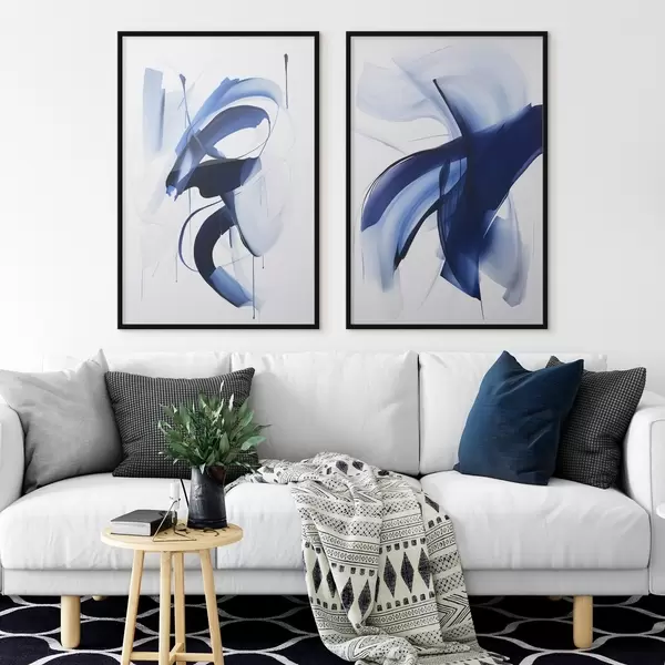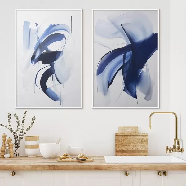 Plakatas Abstrakčios mėlynos teptuko potėpių formos su sklandžiomis linijomis ir kreivėmis ant balto fono, modernusis menas d01240