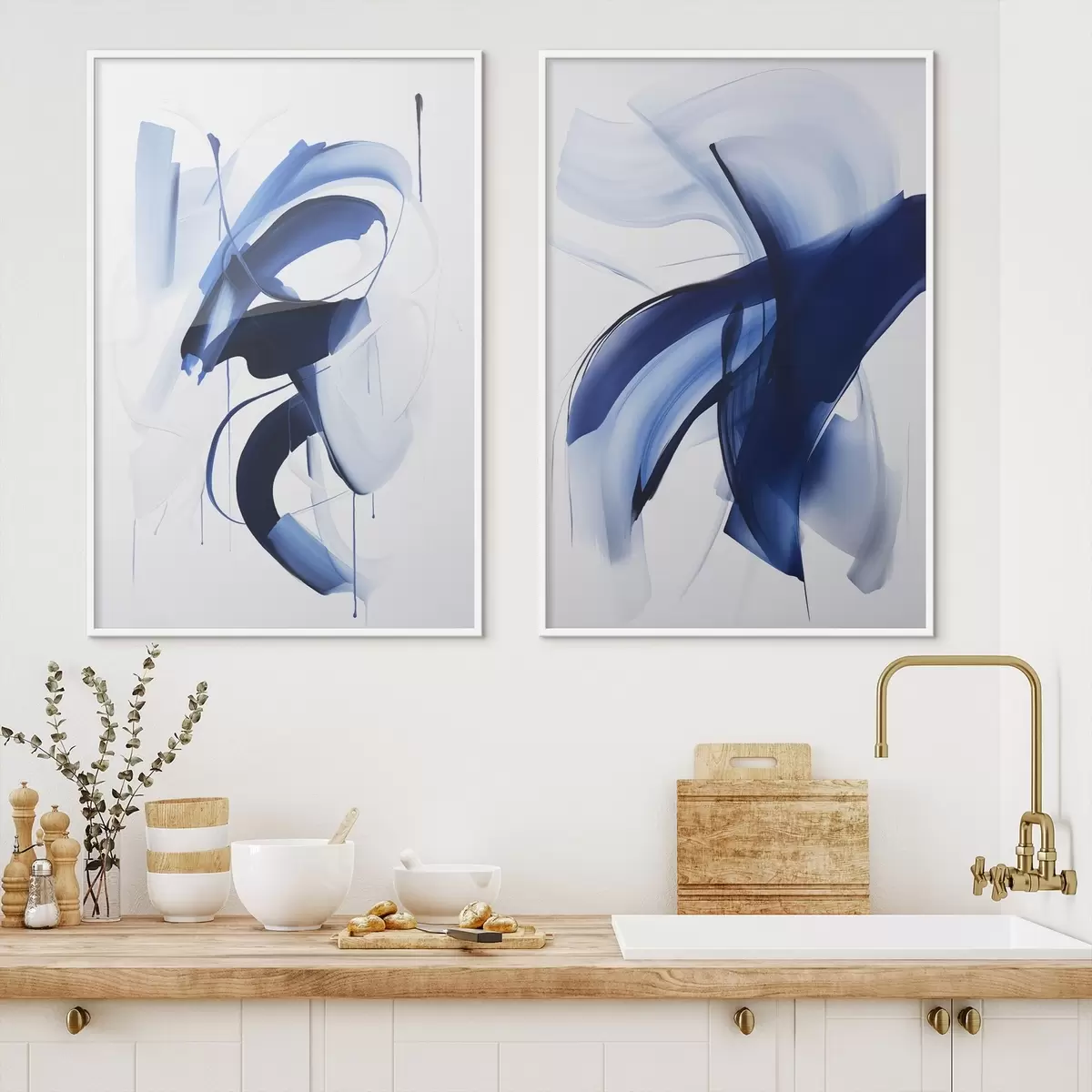 Plakatas Abstrakčios mėlynos teptuko potėpių formos su sklandžiomis linijomis ir kreivėmis ant balto fono, modernusis menas Ne d01240