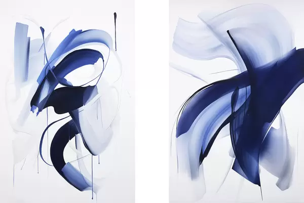 Plakatas Abstrakčios mėlynos teptuko potėpių formos su sklandžiomis linijomis ir kreivėmis ant balto fono, modernusis menas d01240