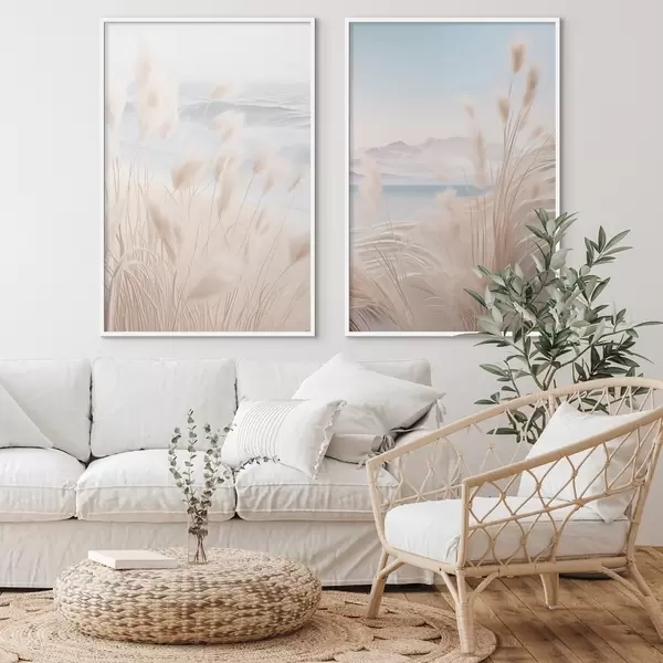 Plakatas Aukšta, plunksniška pampų žolė švelnių smėlio atspalvių pirmame plane, o fone – smėlio paplūdimys. d01242