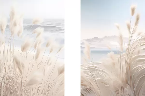 Plakatas Aukšta, plunksniška pampų žolė švelnių smėlio atspalvių pirmame plane, o fone – smėlio paplūdimys. d01242
