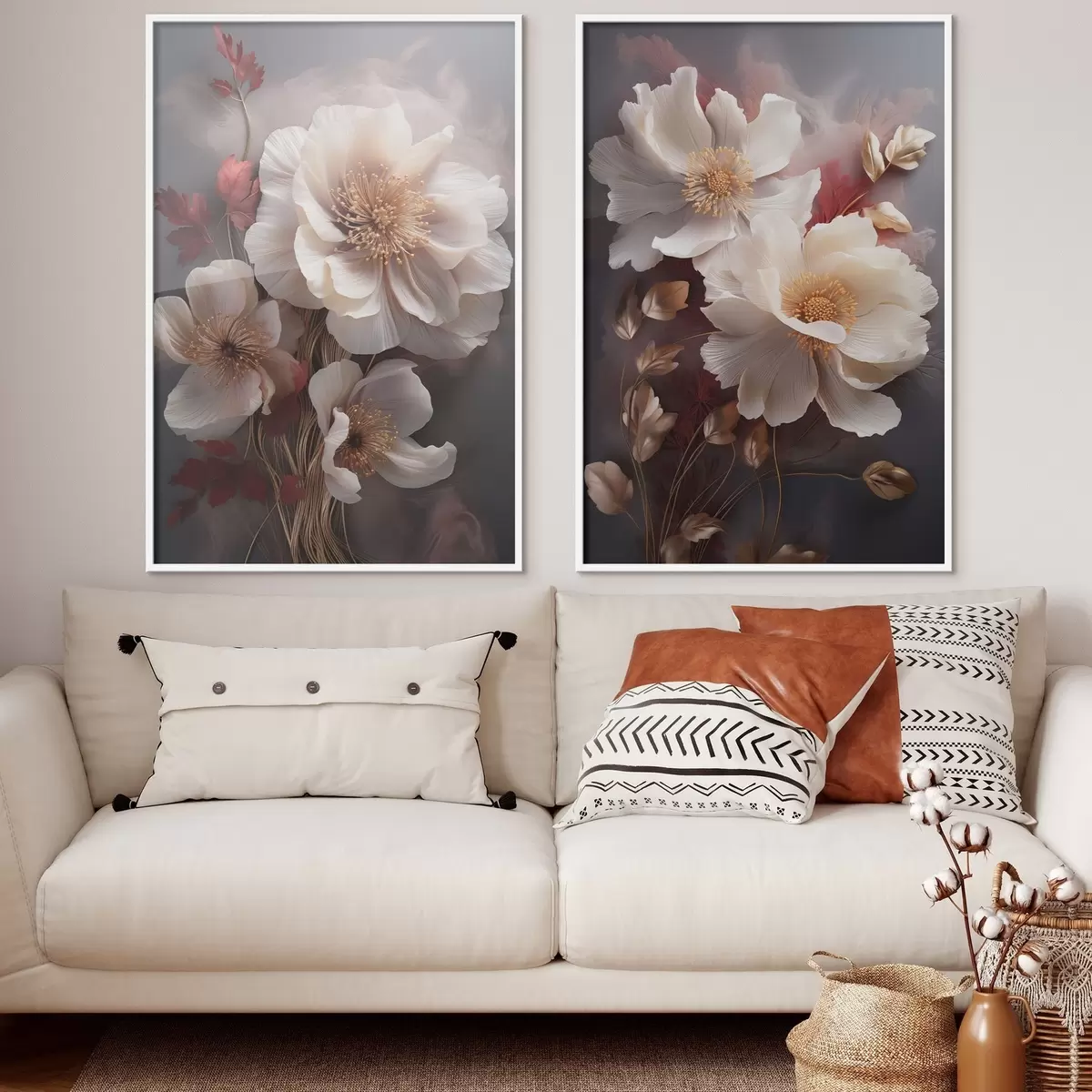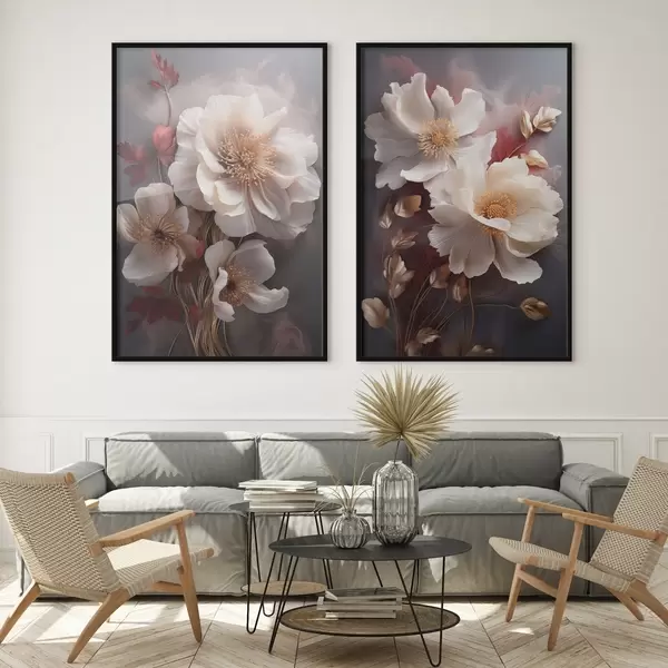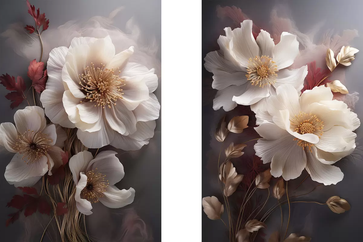 Plakatas Subtilūs bijūnai su plonais, plaušėtais žiedlapiais, apsupti tamsiai raudonais ir geltonais lapais ant abstraktaus fono d01243