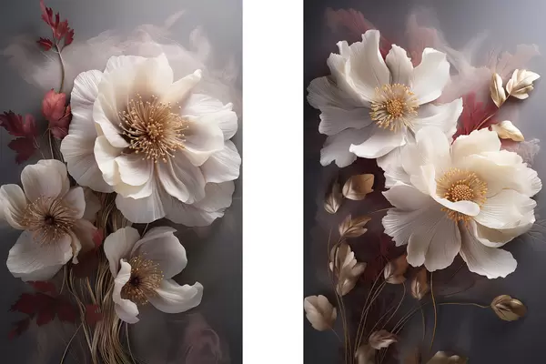 Plakatas Subtilūs bijūnai su plonais, plaušėtais žiedlapiais, apsupti tamsiai raudonais ir geltonais lapais ant abstraktaus fono Ne d01243