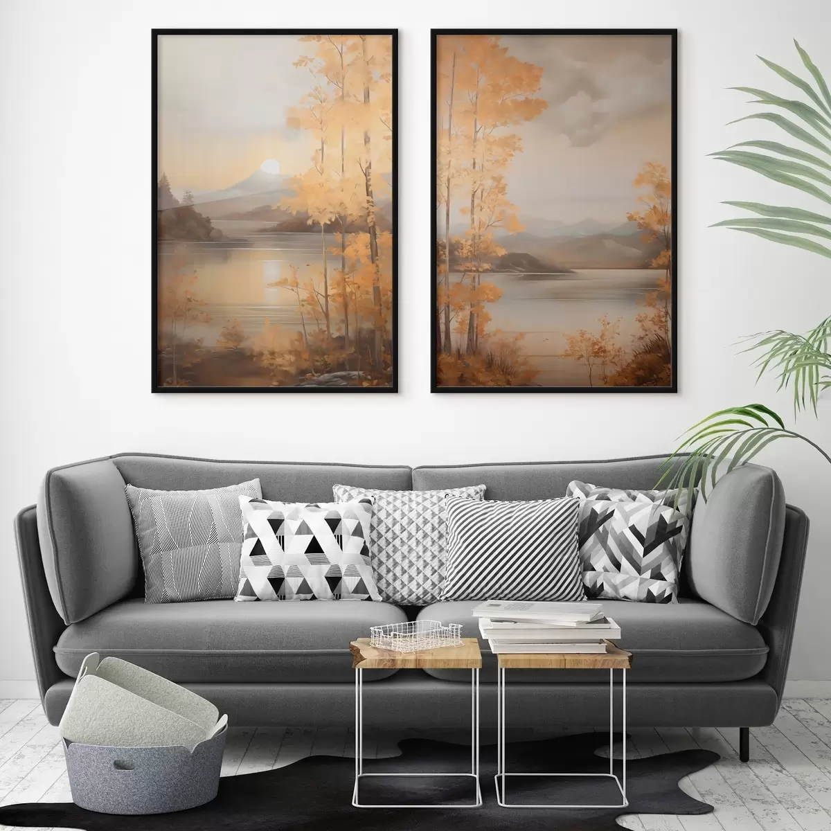 Plakatas Rudens tekstūruoti medžiai su oranžiniais lapais apjuosia ramią ežerą su tolimais kalnais po debesuotu dangumi. Ne d01246