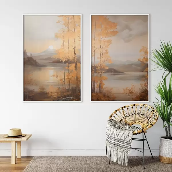 Plakatas Rudens tekstūruoti medžiai su oranžiniais lapais apjuosia ramią ežerą su tolimais kalnais po debesuotu dangumi. d01246