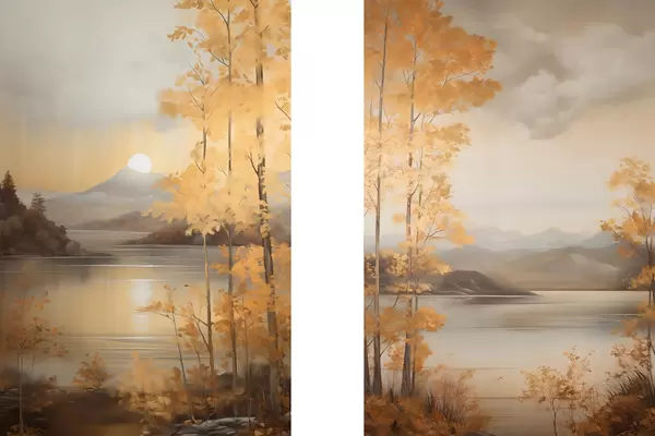 Plakatas Rudens tekstūruoti medžiai su oranžiniais lapais apjuosia ramią ežerą su tolimais kalnais po debesuotu dangumi. d01246