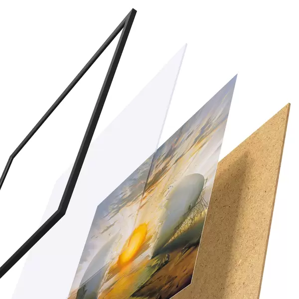 Plakatą sudaro rėmas, pleksiklas, atspausdintas vaizdas ir medžio drožlių plokštės pagrindas. Plakatą galima iš karto pakabinti ant sienos dėl kitoje pusėje esančių laikiklių.