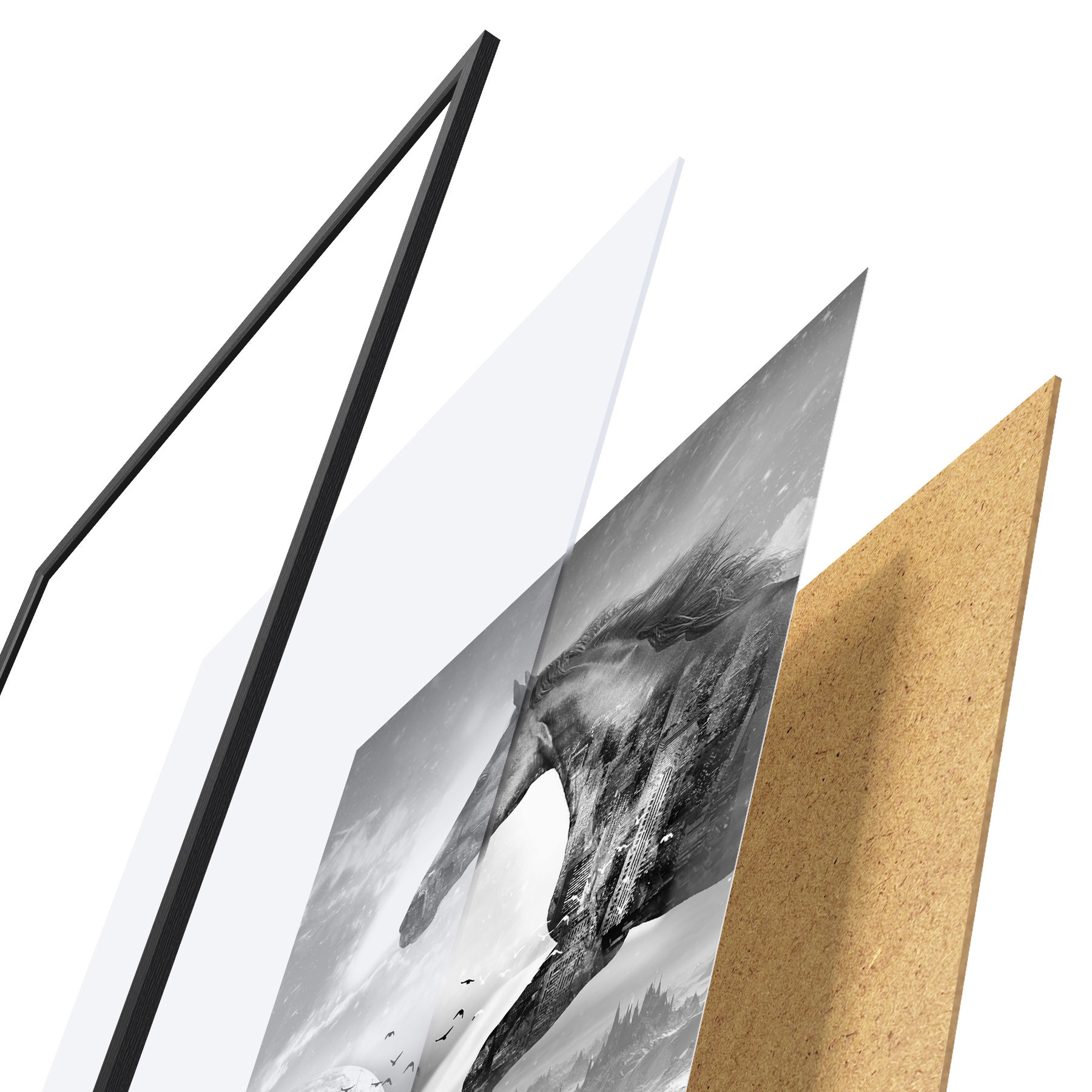 Plakatą sudaro rėmas, pleksiklas, atspausdintas vaizdas ir medžio drožlių plokštės pagrindas. Plakatą galima iš karto pakabinti ant sienos dėl kitoje pusėje esančių laikiklių.