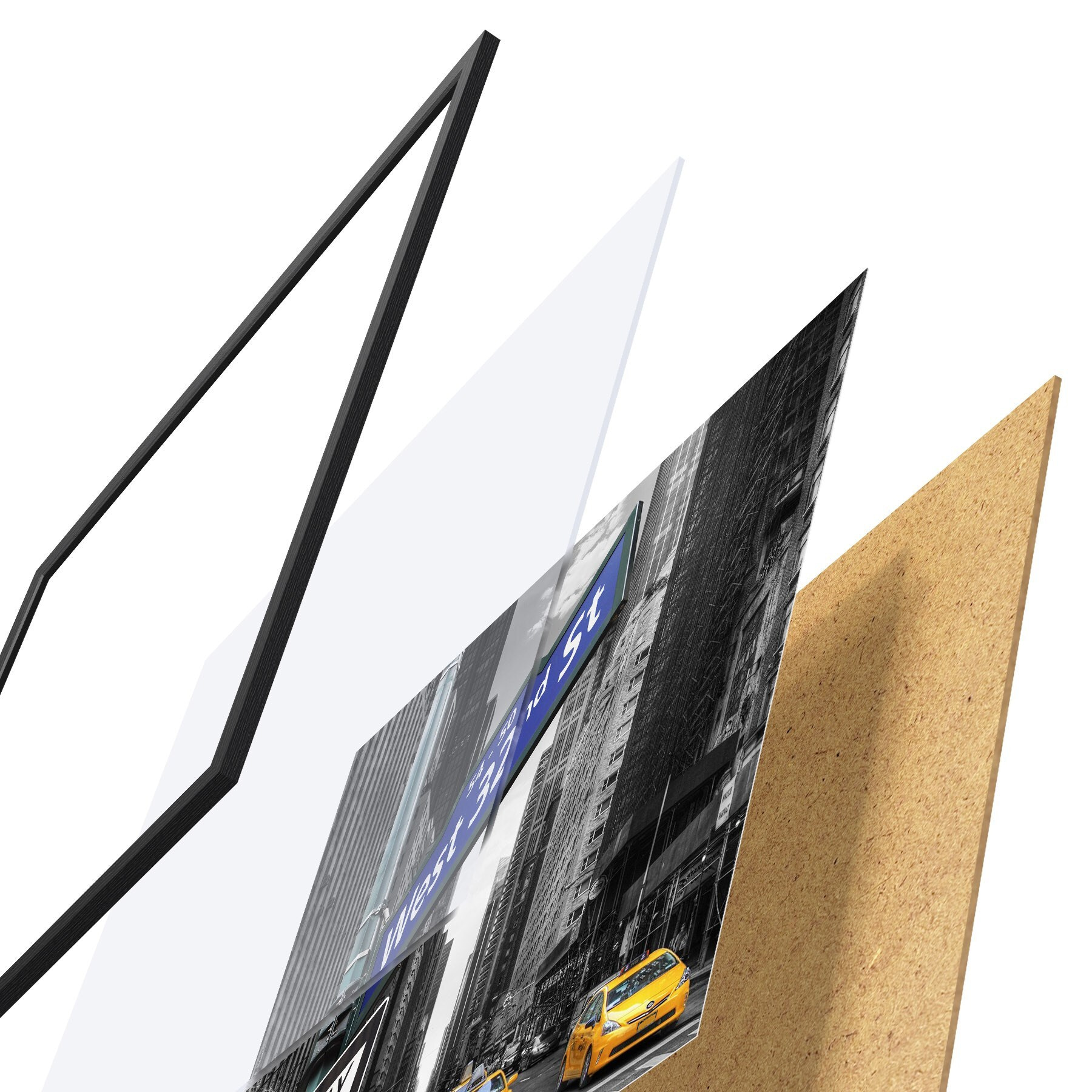 Plakatą sudaro rėmas, pleksiklas, atspausdintas vaizdas ir medžio drožlių plokštės pagrindas. Plakatą galima iš karto pakabinti ant sienos dėl kitoje pusėje esančių laikiklių.
