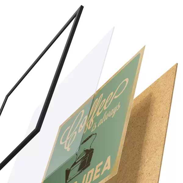 Plakatą sudaro rėmas, pleksiklas, atspausdintas vaizdas ir medžio drožlių plokštės pagrindas. Plakatą galima iš karto pakabinti ant sienos dėl kitoje pusėje esančių laikiklių.