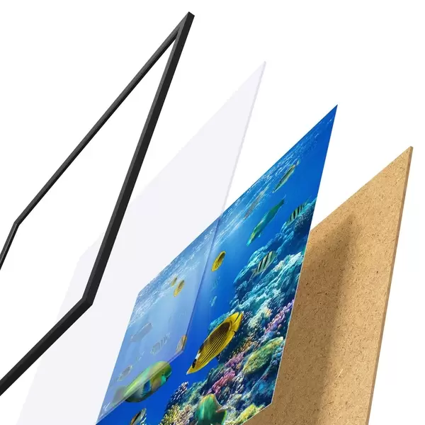 Plakatą sudaro rėmas, pleksiklas, atspausdintas vaizdas ir medžio drožlių plokštės pagrindas. Plakatą galima iš karto pakabinti ant sienos dėl kitoje pusėje esančių laikiklių.