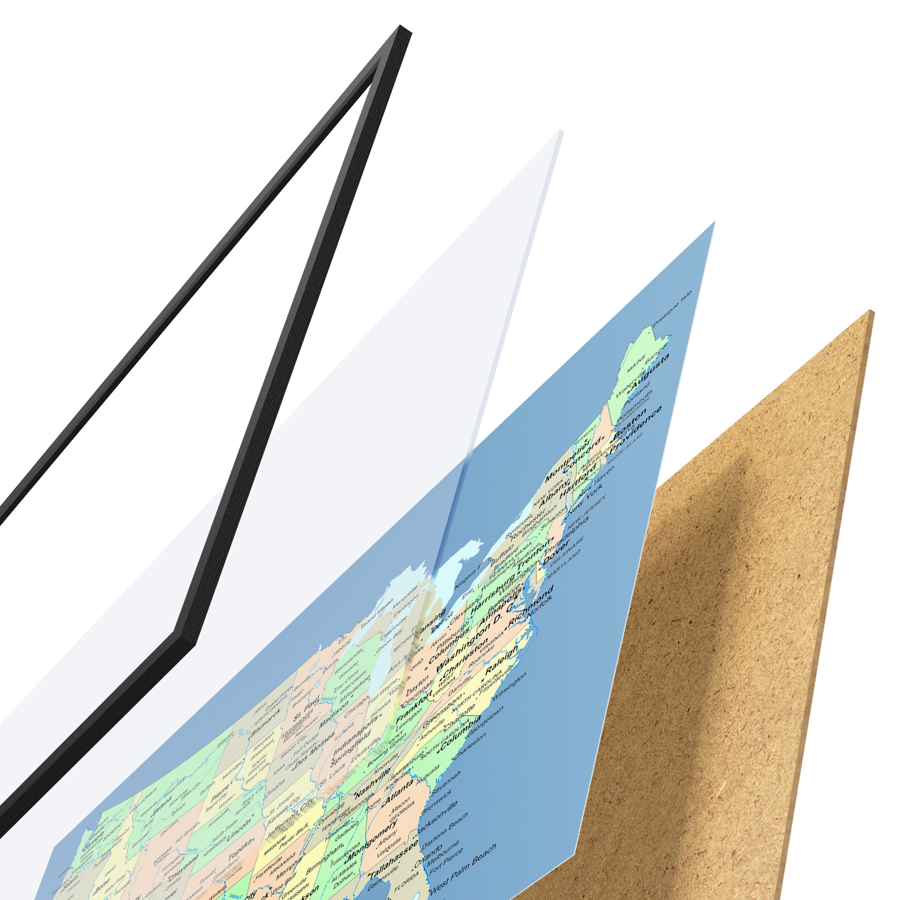 Plakatą sudaro rėmas, pleksiklas, atspausdintas vaizdas ir medžio drožlių plokštės pagrindas. Plakatą galima iš karto pakabinti ant sienos dėl kitoje pusėje esančių laikiklių.