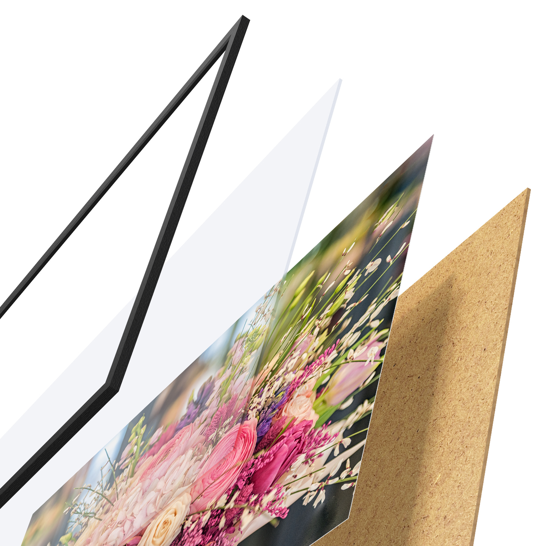 Plakatą sudaro rėmas, pleksiklas, atspausdintas vaizdas ir medžio drožlių plokštės pagrindas. Plakatą galima iš karto pakabinti ant sienos dėl kitoje pusėje esančių laikiklių.