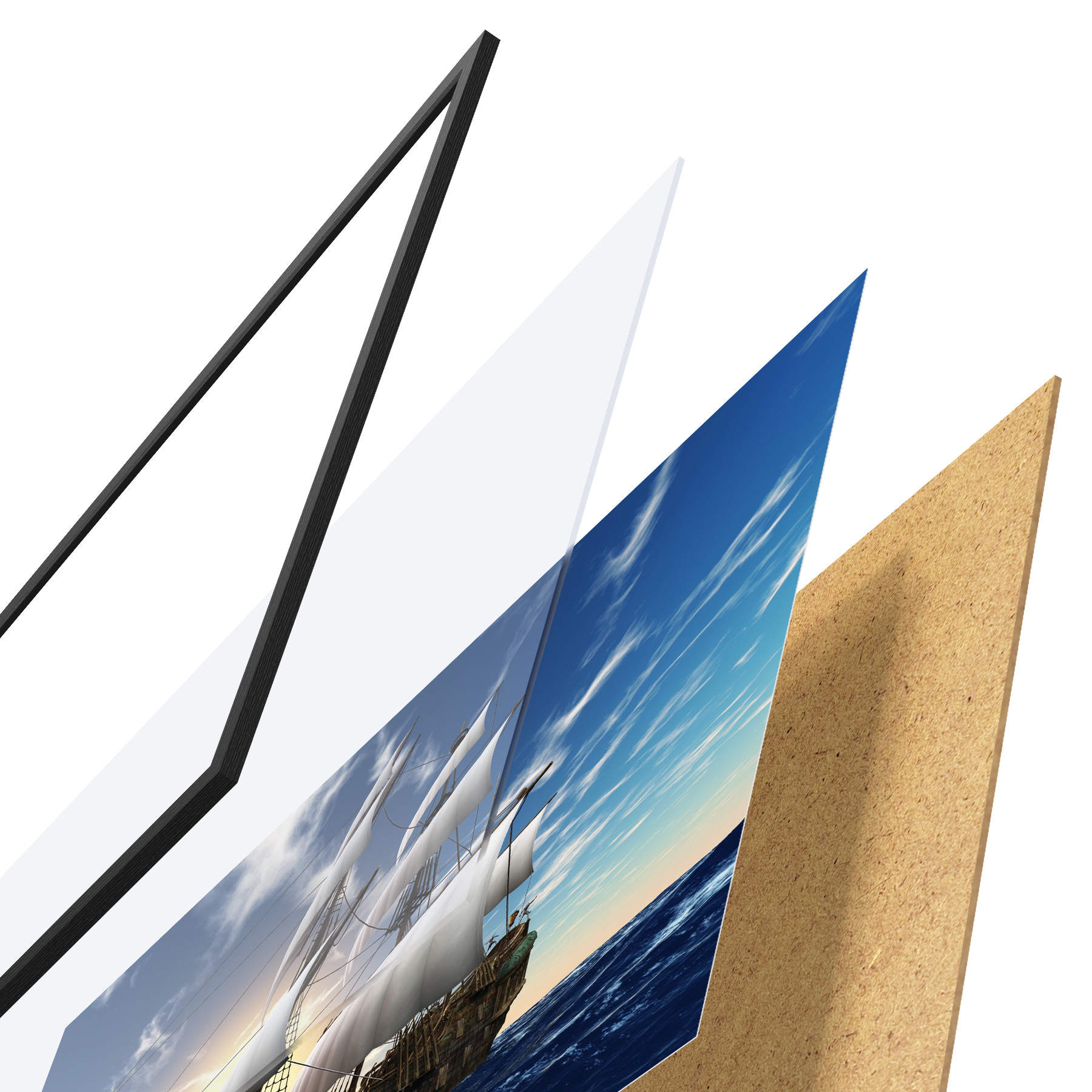 Plakatą sudaro rėmas, pleksiklas, atspausdintas vaizdas ir medžio drožlių plokštės pagrindas. Plakatą galima iš karto pakabinti ant sienos dėl kitoje pusėje esančių laikiklių.