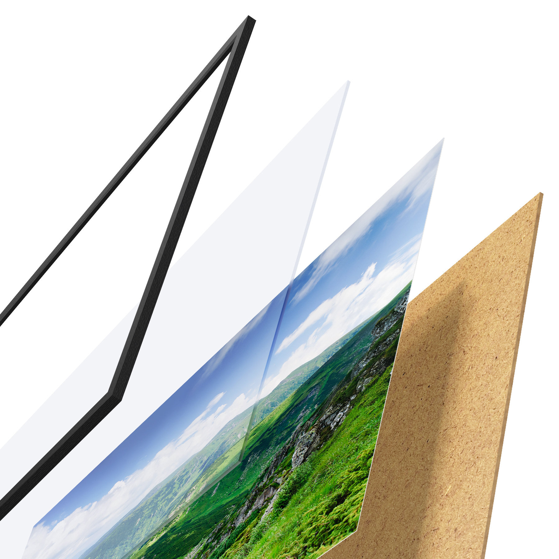 Plakatą sudaro rėmas, pleksiklas, atspausdintas vaizdas ir medžio drožlių plokštės pagrindas. Plakatą galima iš karto pakabinti ant sienos dėl kitoje pusėje esančių laikiklių.
