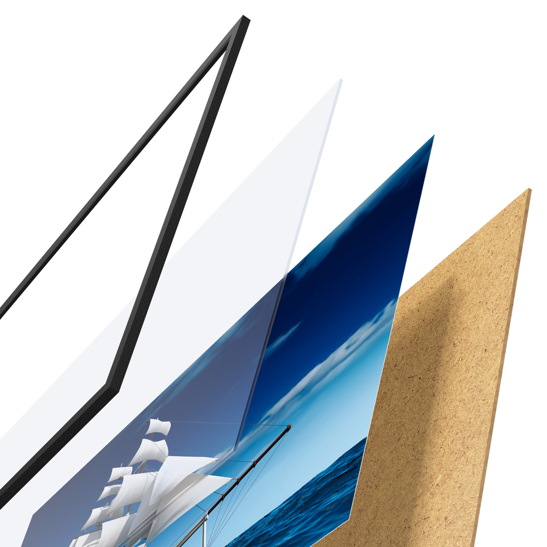 Plakatą sudaro rėmas, pleksiklas, atspausdintas vaizdas ir medžio drožlių plokštės pagrindas. Plakatą galima iš karto pakabinti ant sienos dėl kitoje pusėje esančių laikiklių.