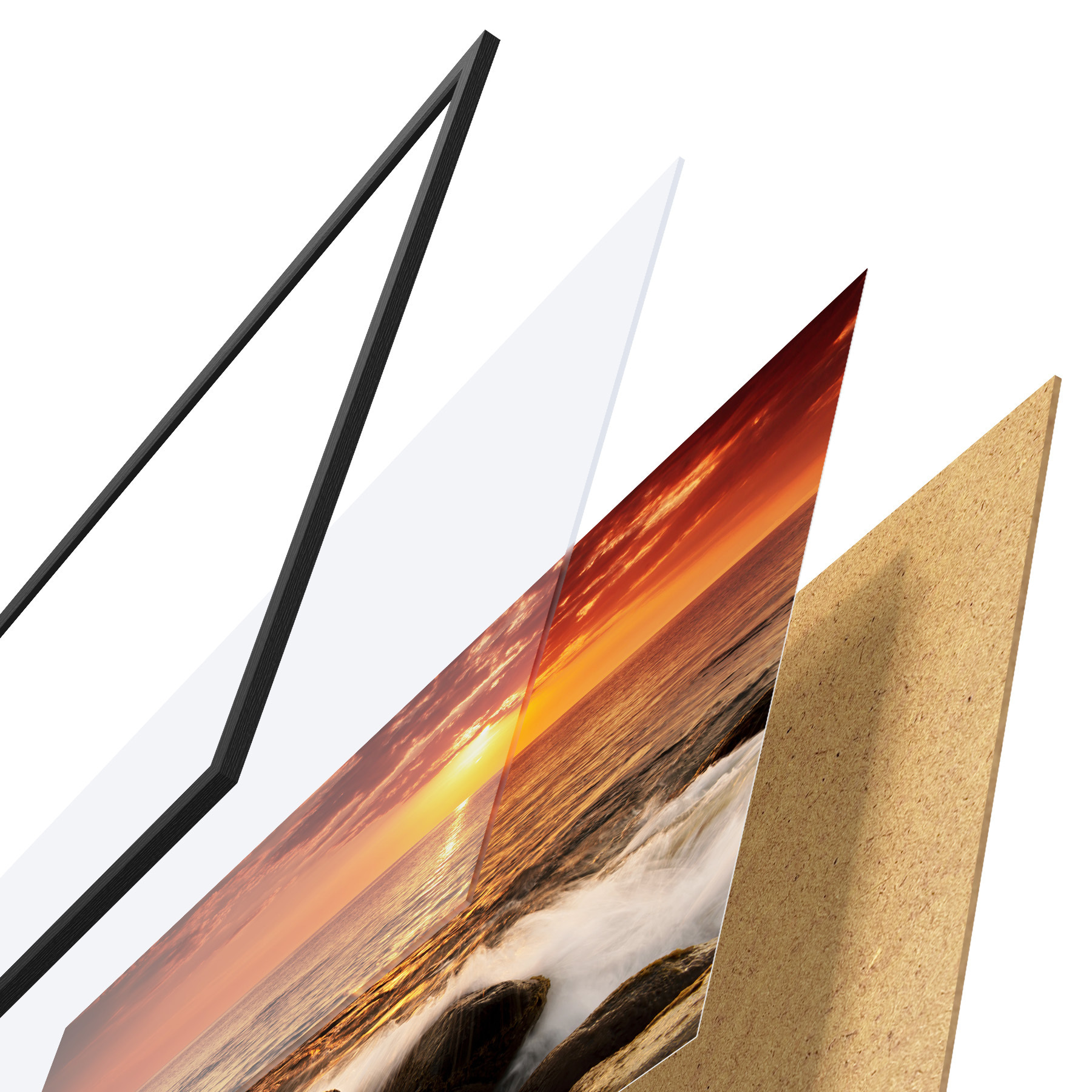 Plakatą sudaro rėmas, pleksiklas, atspausdintas vaizdas ir medžio drožlių plokštės pagrindas. Plakatą galima iš karto pakabinti ant sienos dėl kitoje pusėje esančių laikiklių.