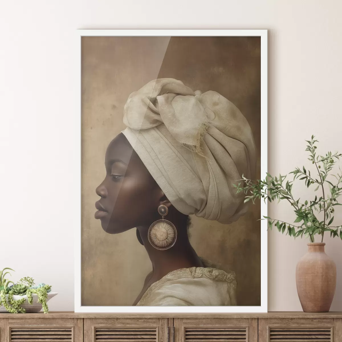 Plakatas smėlio spalvos afrikietiško stiliaus moters portretas profilyje su dideliais auskarais Ne f26120
