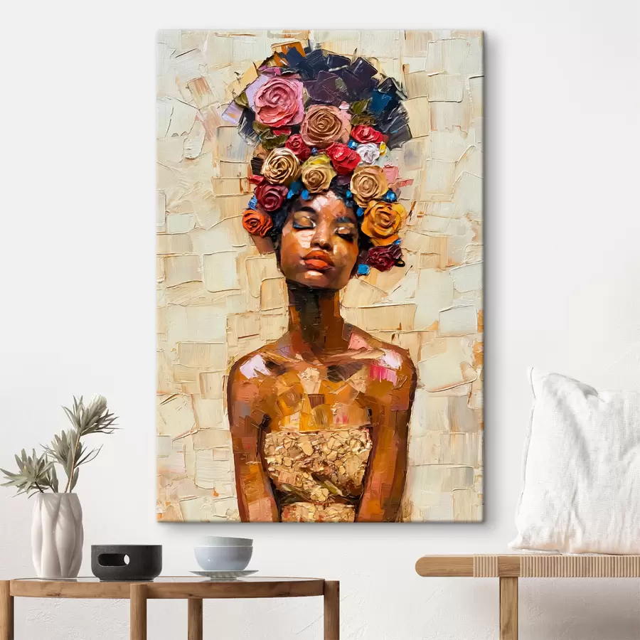 Plakatas smėlio spalvos afrikietiško stiliaus moters portretas profilyje su dideliais auskarais f26120