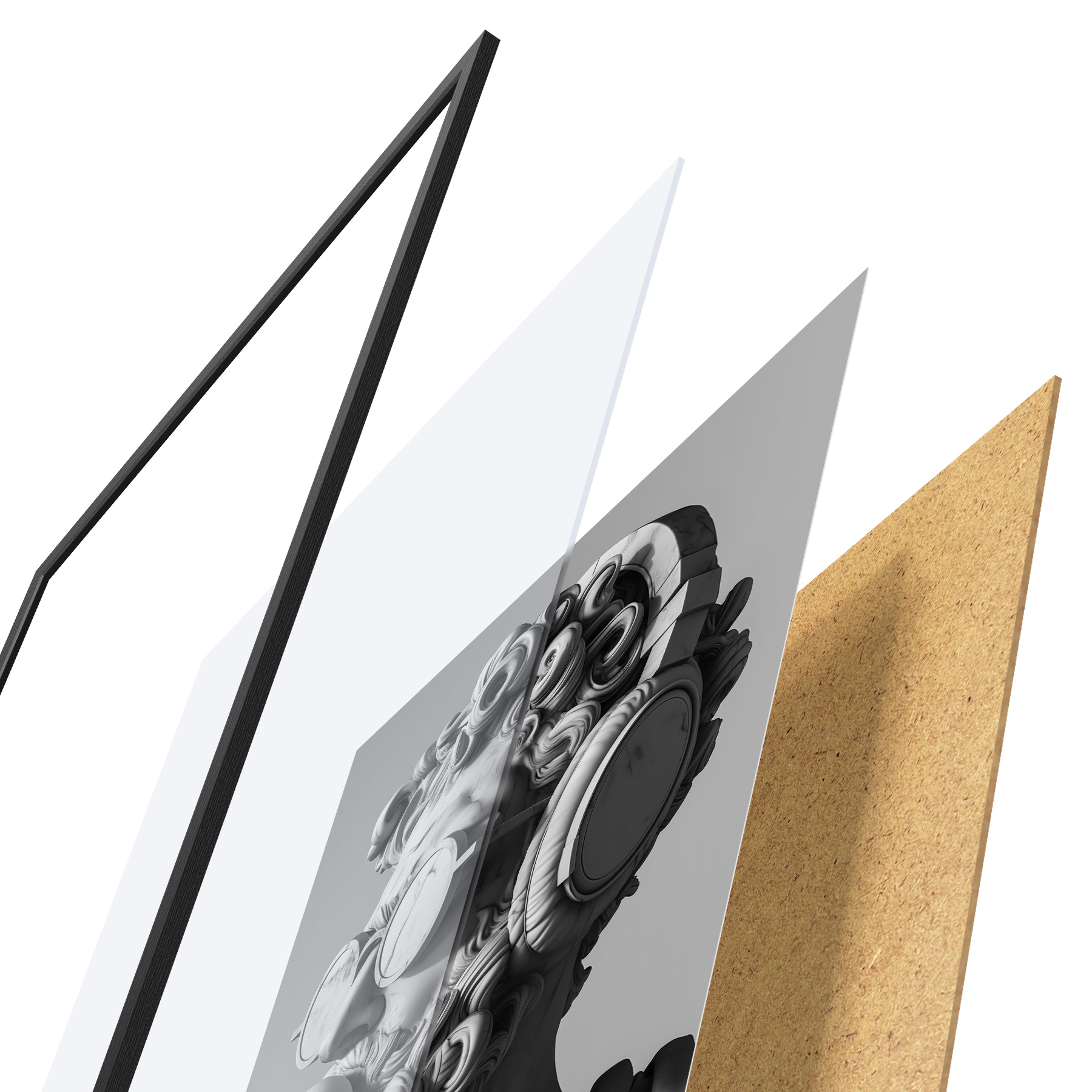 Plakatą sudaro rėmas, pleksiklas, atspausdintas vaizdas ir medžio drožlių plokštės pagrindas. Plakatą galima iš karto pakabinti ant sienos dėl kitoje pusėje esančių laikiklių.