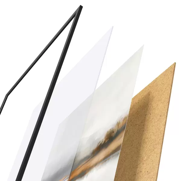 Plakatą sudaro rėmas, pleksiklas, atspausdintas vaizdas ir medžio drožlių plokštės pagrindas. Plakatą galima iš karto pakabinti ant sienos dėl kitoje pusėje esančių laikiklių.