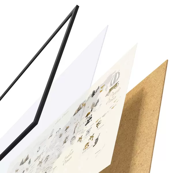 Plakatą sudaro rėmas, pleksiklas, atspausdintas vaizdas ir medžio drožlių plokštės pagrindas. Plakatą galima iš karto pakabinti ant sienos dėl kitoje pusėje esančių laikiklių.