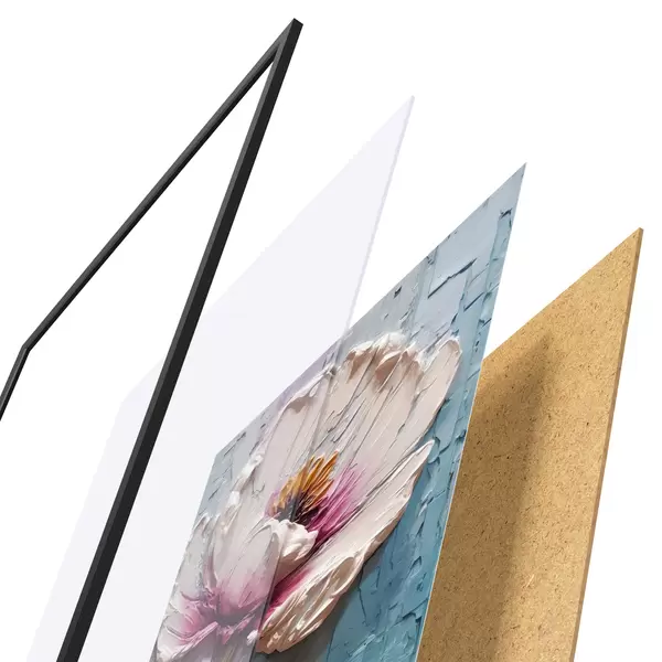 Plakatą sudaro rėmas, pleksiklas, atspausdintas vaizdas ir medžio drožlių plokštės pagrindas. Plakatą galima iš karto pakabinti ant sienos dėl kitoje pusėje esančių laikiklių.