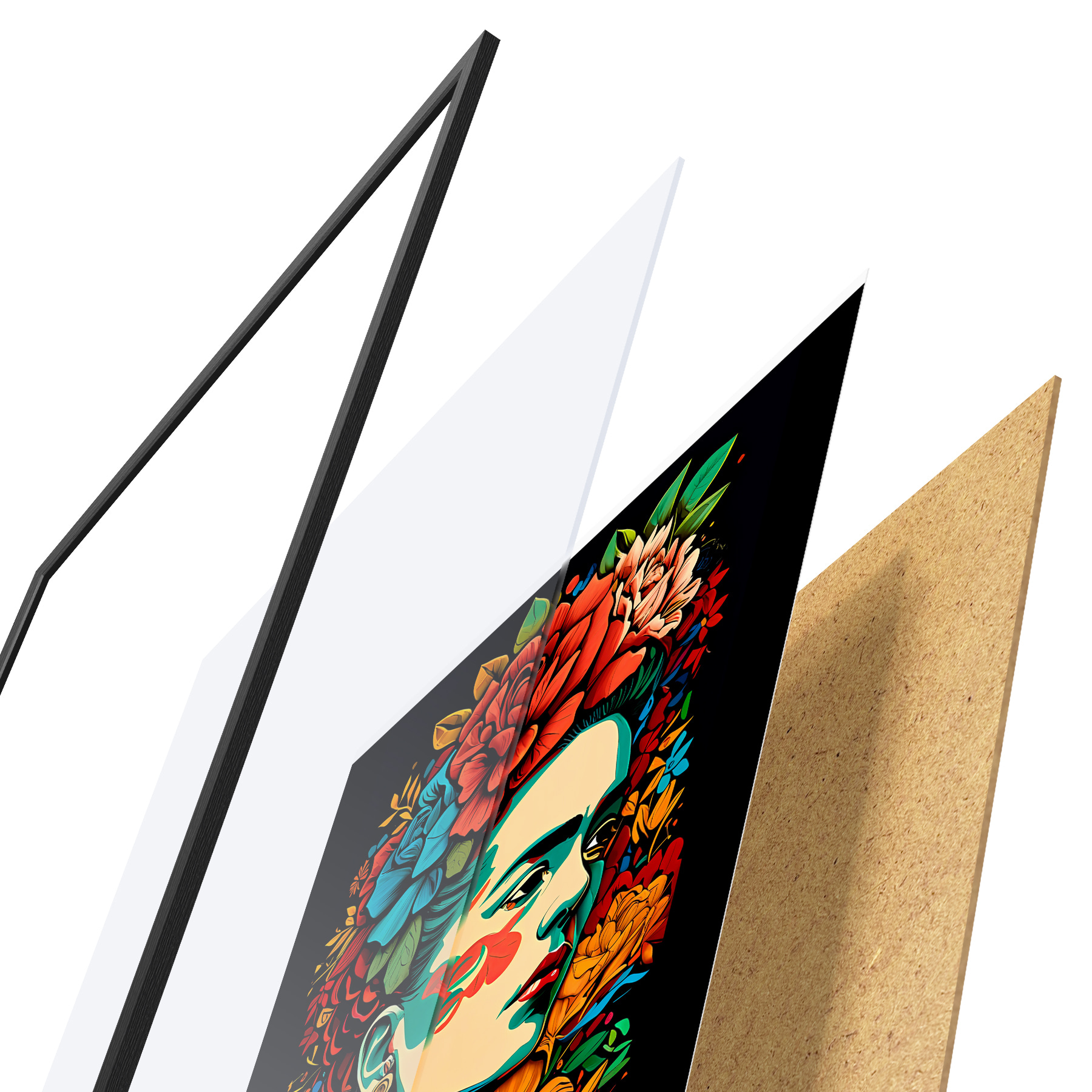 Plakatą sudaro rėmas, pleksiklas, atspausdintas vaizdas ir medžio drožlių plokštės pagrindas. Plakatą galima iš karto pakabinti ant sienos dėl kitoje pusėje esančių laikiklių.