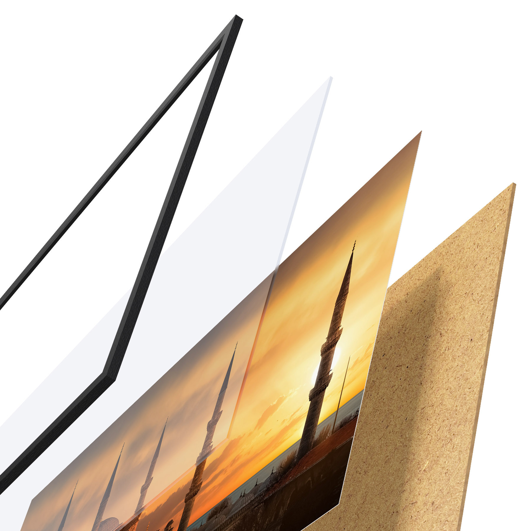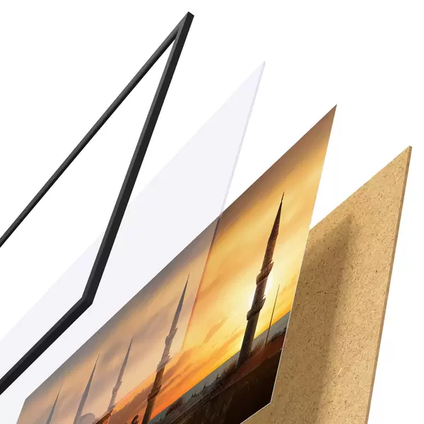 Plakatą sudaro rėmas, pleksiklas, atspausdintas vaizdas ir medžio drožlių plokštės pagrindas. Plakatą galima iš karto pakabinti ant sienos dėl kitoje pusėje esančių laikiklių.