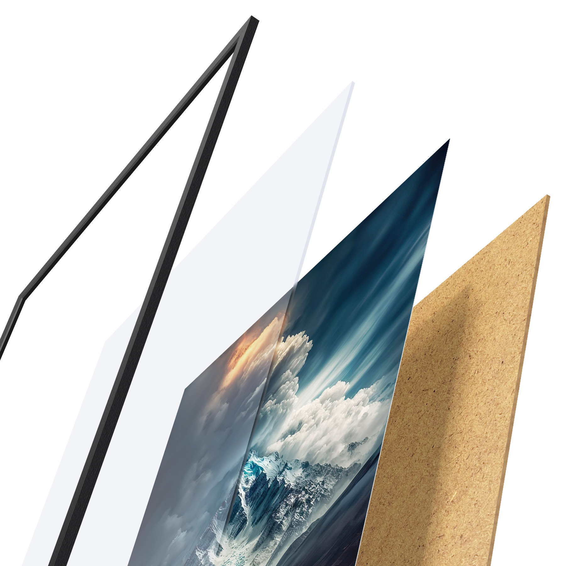 Plakatą sudaro rėmas, pleksiklas, atspausdintas vaizdas ir medžio drožlių plokštės pagrindas. Plakatą galima iš karto pakabinti ant sienos dėl kitoje pusėje esančių laikiklių.