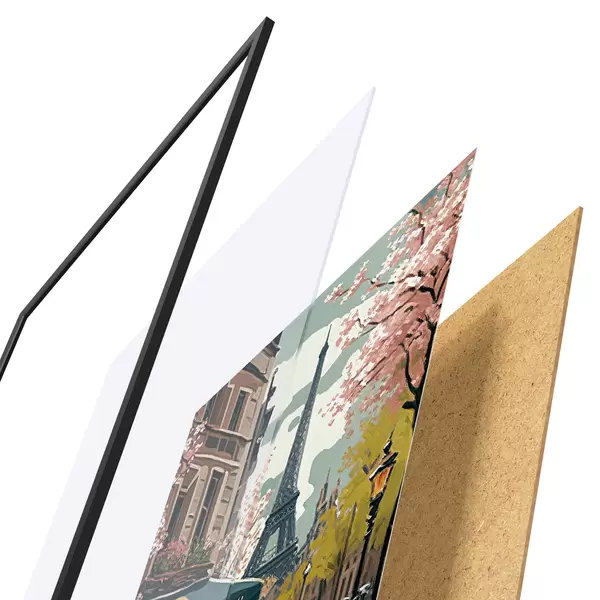 Plakatą sudaro rėmas, pleksiklas, atspausdintas vaizdas ir medžio drožlių plokštės pagrindas. Plakatą galima iš karto pakabinti ant sienos dėl kitoje pusėje esančių laikiklių.
