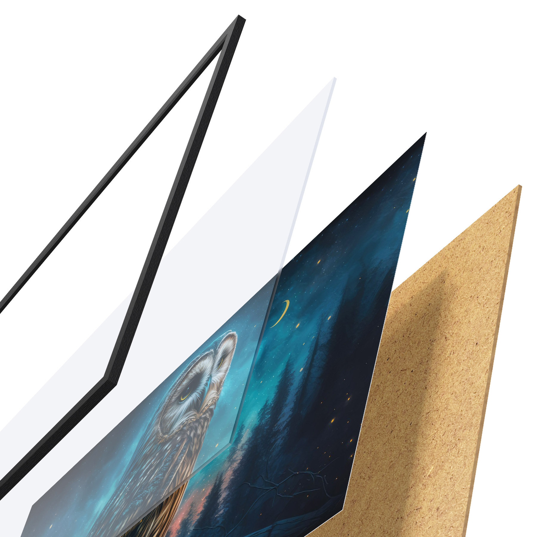 Plakatą sudaro rėmas, pleksiklas, atspausdintas vaizdas ir medžio drožlių plokštės pagrindas. Plakatą galima iš karto pakabinti ant sienos dėl kitoje pusėje esančių laikiklių.