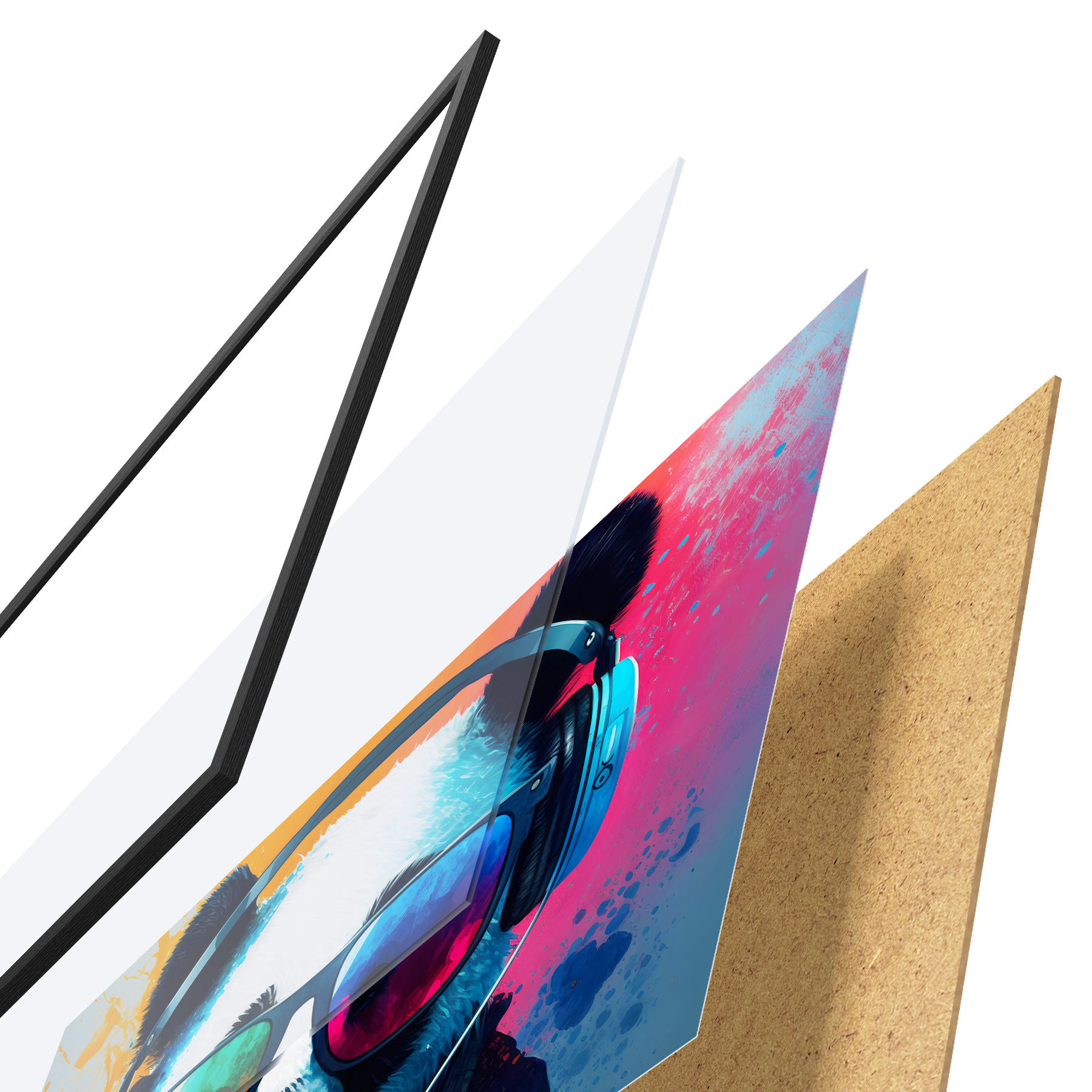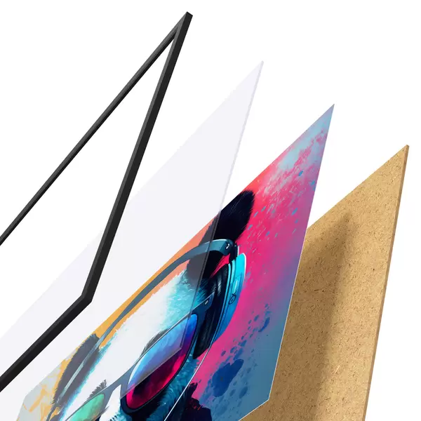 Plakatą sudaro rėmas, pleksiklas, atspausdintas vaizdas ir medžio drožlių plokštės pagrindas. Plakatą galima iš karto pakabinti ant sienos dėl kitoje pusėje esančių laikiklių.