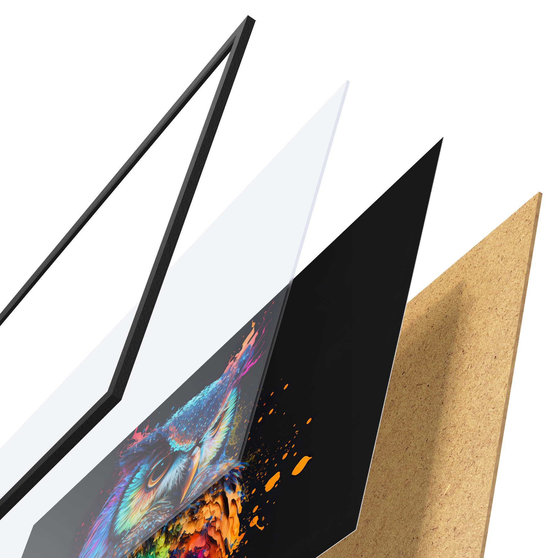 Plakatą sudaro rėmas, pleksiklas, atspausdintas vaizdas ir medžio drožlių plokštės pagrindas. Plakatą galima iš karto pakabinti ant sienos dėl kitoje pusėje esančių laikiklių.