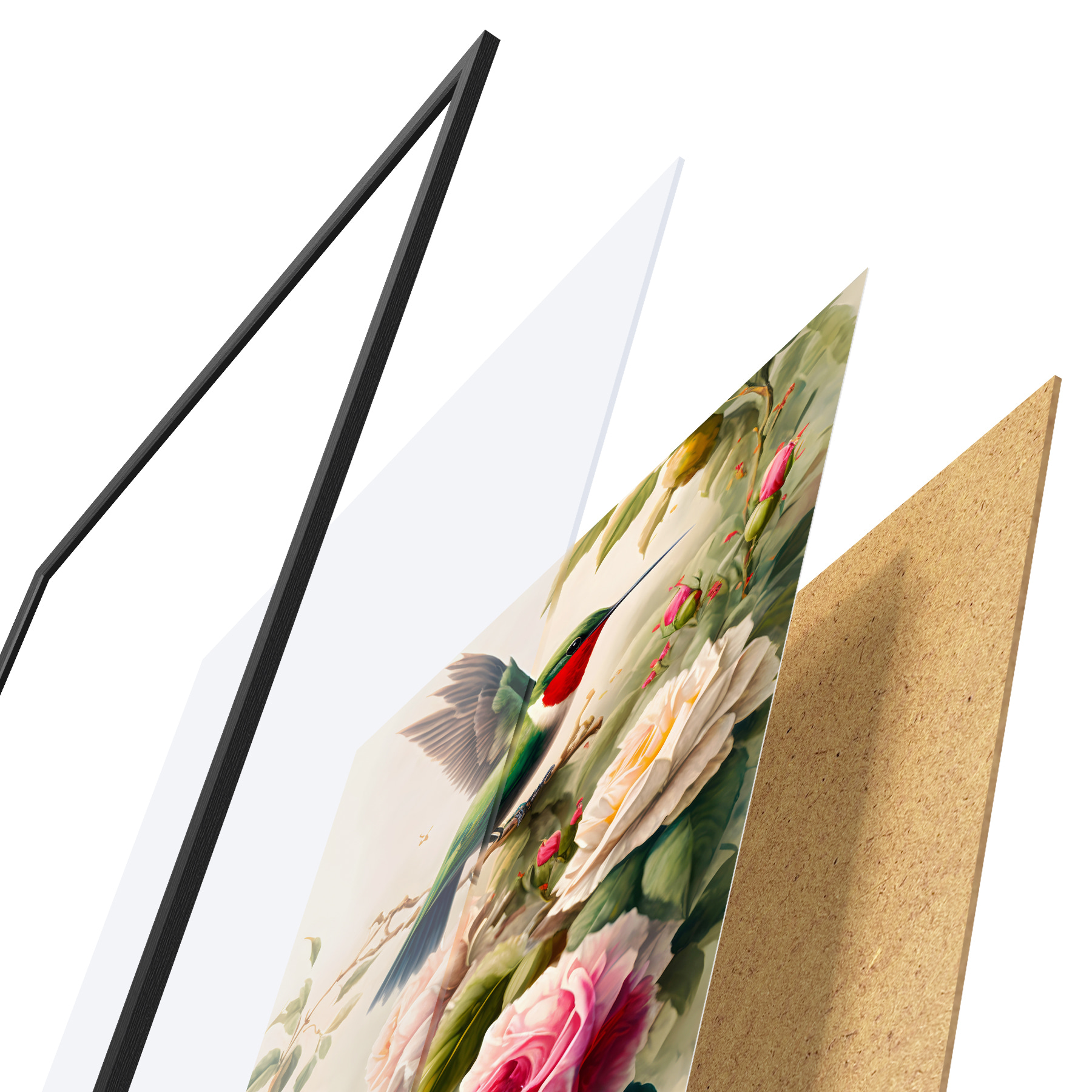 Plakatą sudaro rėmas, pleksiklas, atspausdintas vaizdas ir medžio drožlių plokštės pagrindas. Plakatą galima iš karto pakabinti ant sienos dėl kitoje pusėje esančių laikiklių.
