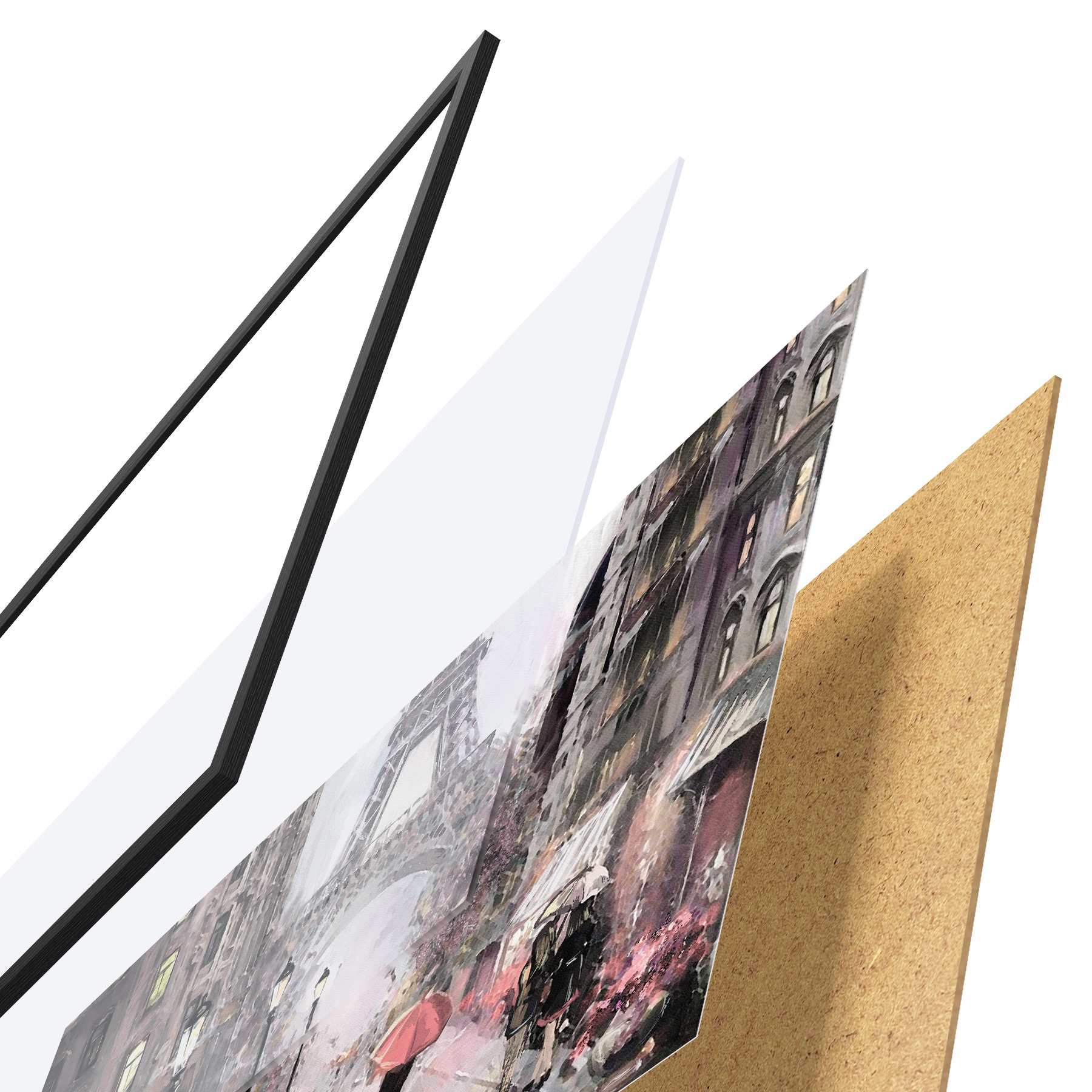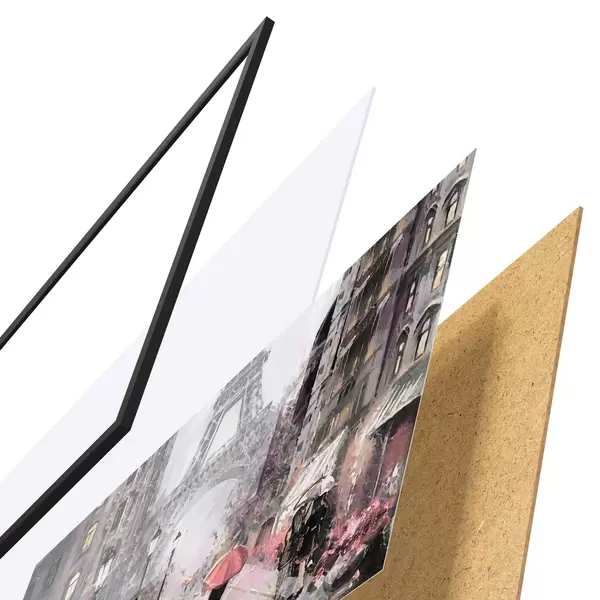 Plakatą sudaro rėmas, pleksiklas, atspausdintas vaizdas ir medžio drožlių plokštės pagrindas. Plakatą galima iš karto pakabinti ant sienos dėl kitoje pusėje esančių laikiklių.