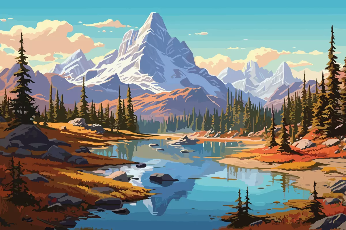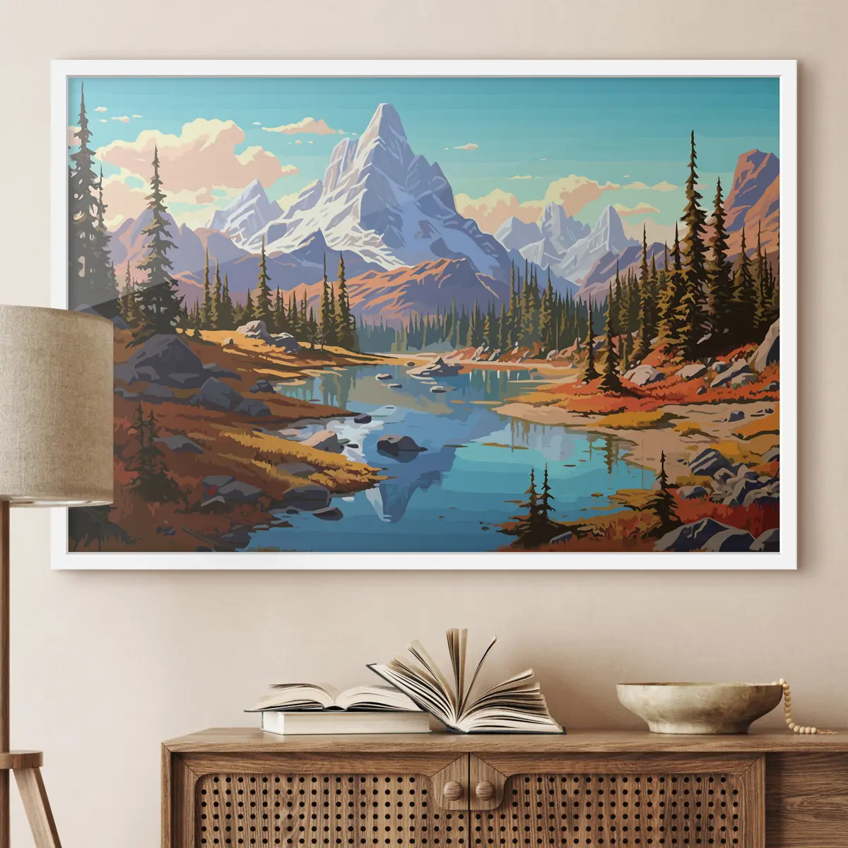 Plakatas Didingi kalnai atsispindi ramiame vandenyje f33951