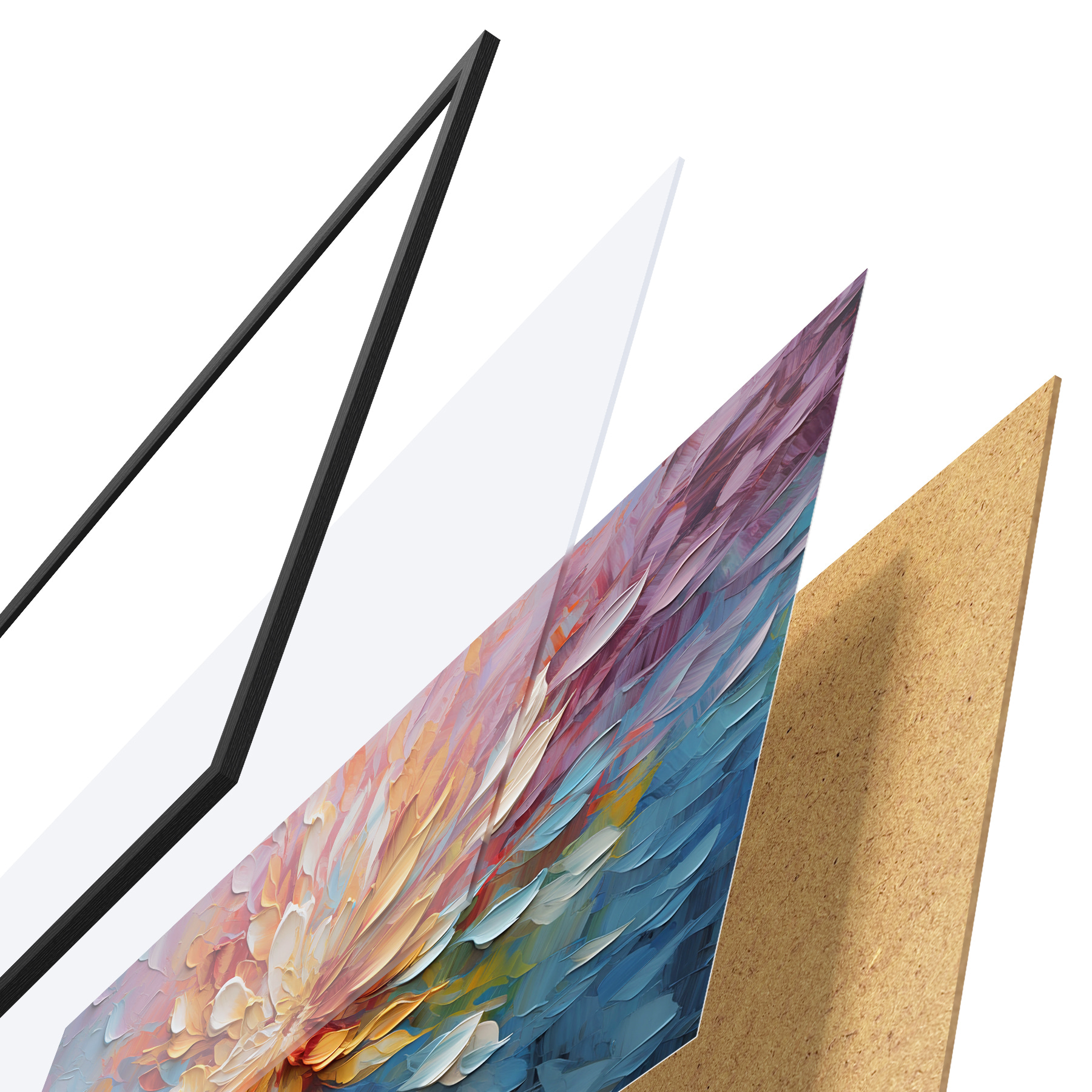 Plakatą sudaro rėmas, pleksiklas, atspausdintas vaizdas ir medžio drožlių plokštės pagrindas. Plakatą galima iš karto pakabinti ant sienos dėl kitoje pusėje esančių laikiklių.