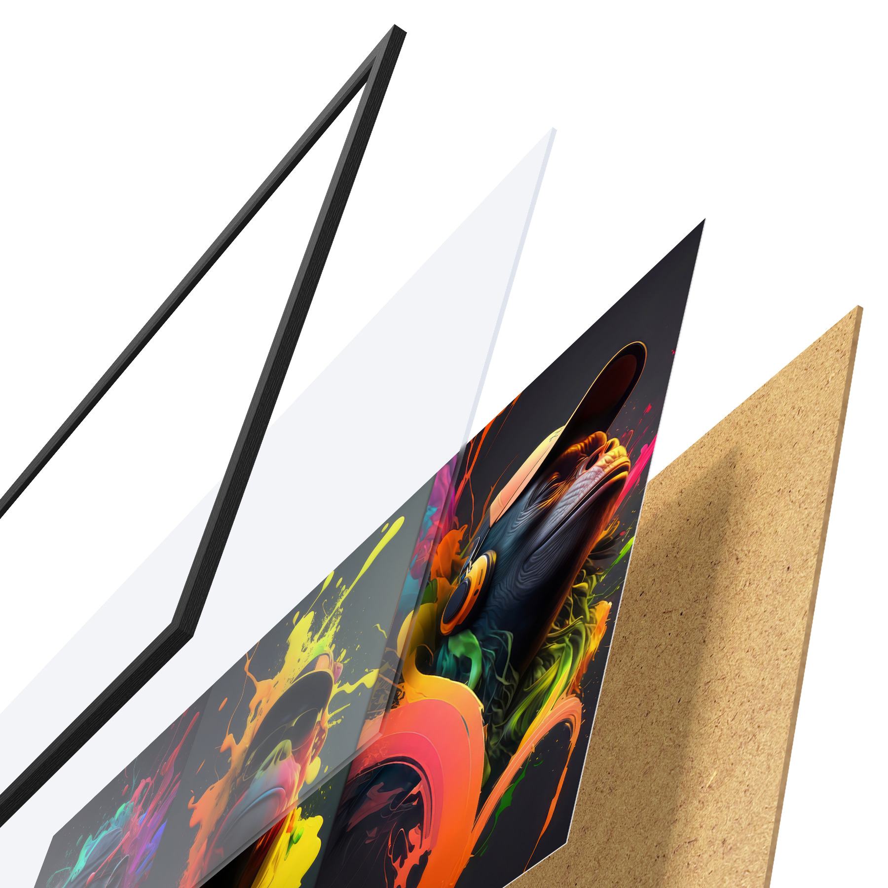 Plakatą sudaro rėmas, pleksiklas, atspausdintas vaizdas ir medžio drožlių plokštės pagrindas. Plakatą galima iš karto pakabinti ant sienos dėl kitoje pusėje esančių laikiklių.