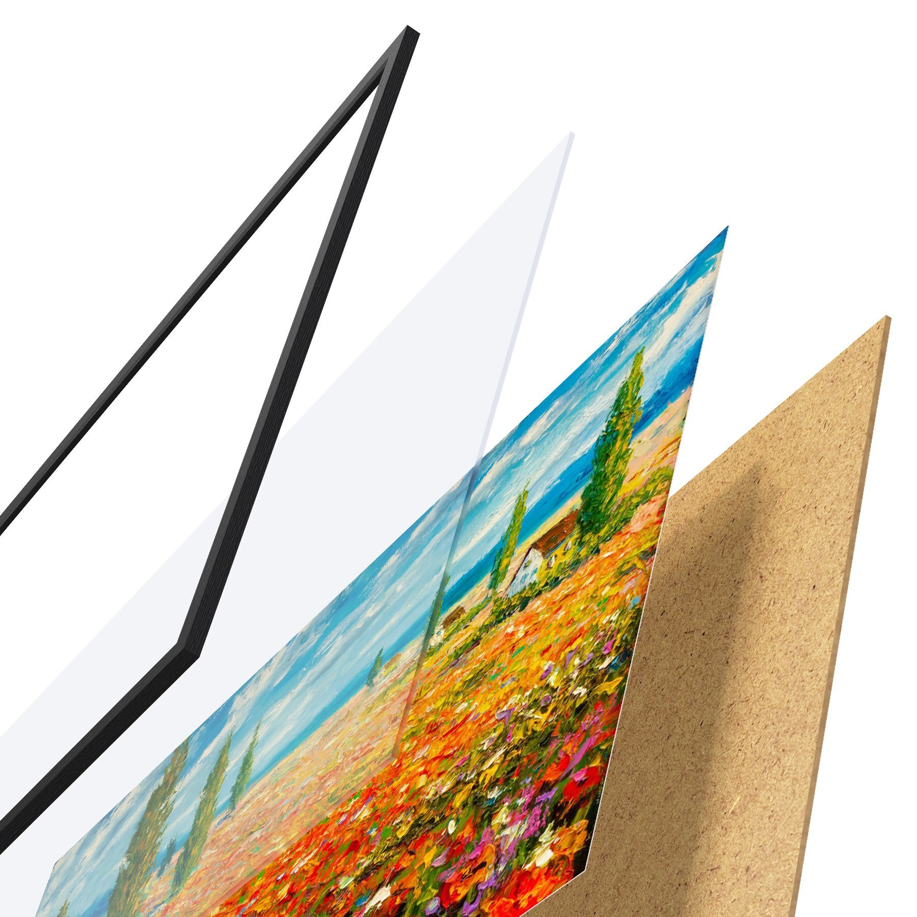 Plakatą sudaro rėmas, pleksiklas, atspausdintas vaizdas ir medžio drožlių plokštės pagrindas. Plakatą galima iš karto pakabinti ant sienos dėl kitoje pusėje esančių laikiklių.