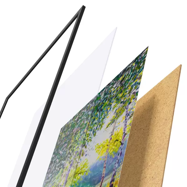 Plakatą sudaro rėmas, pleksiklas, atspausdintas vaizdas ir medžio drožlių plokštės pagrindas. Plakatą galima iš karto pakabinti ant sienos dėl kitoje pusėje esančių laikiklių.