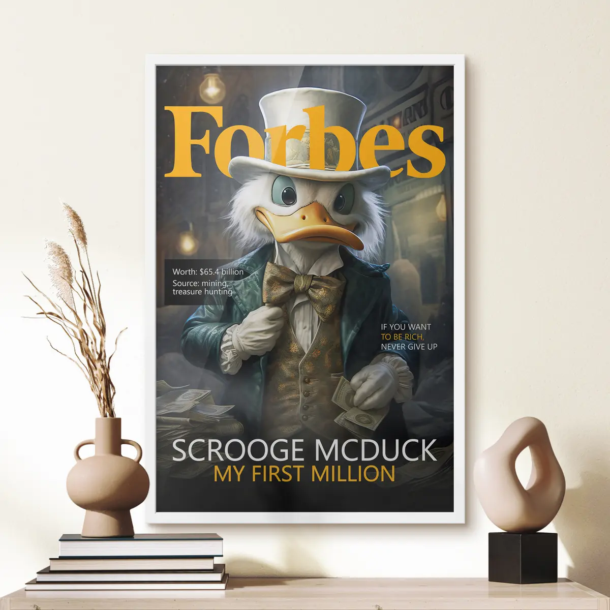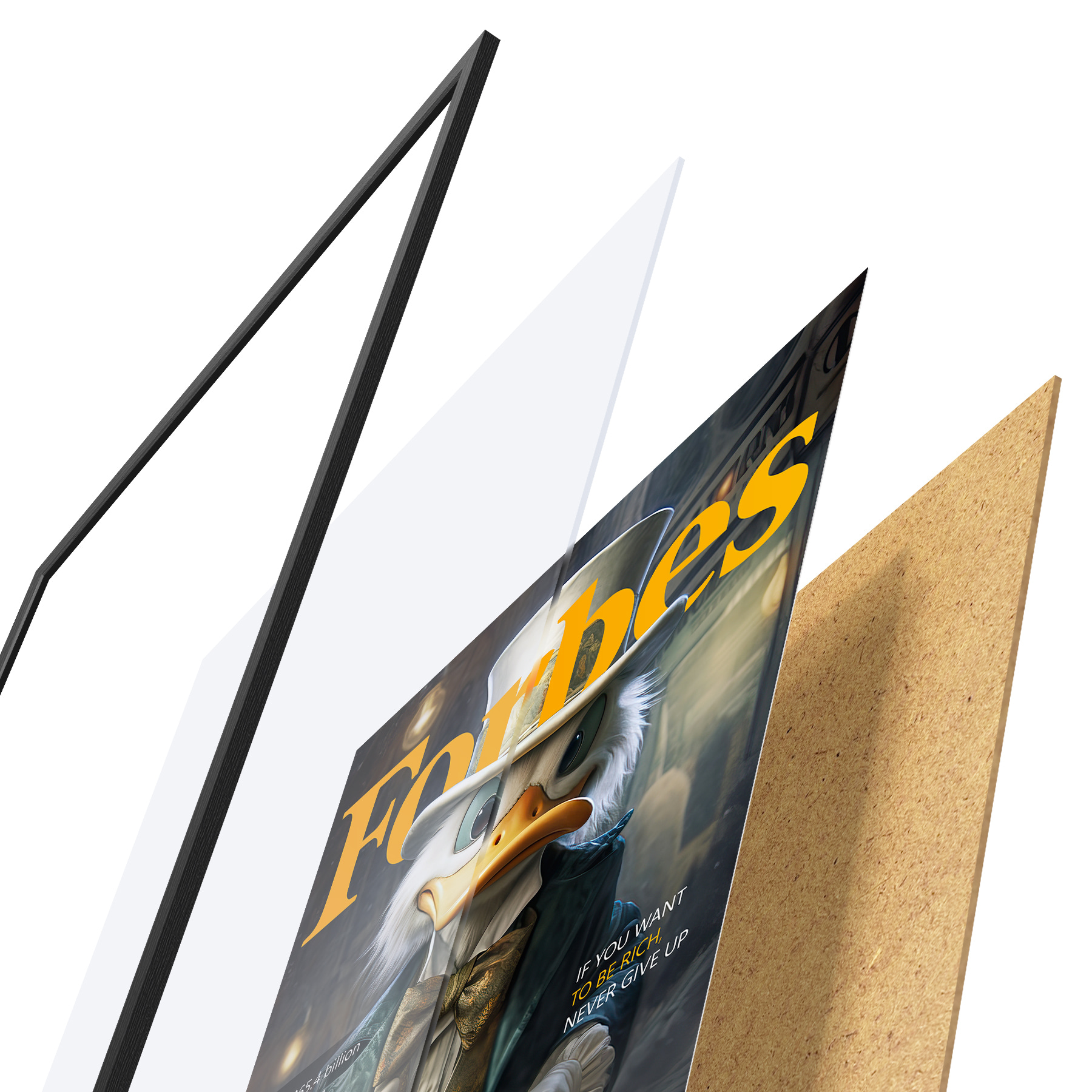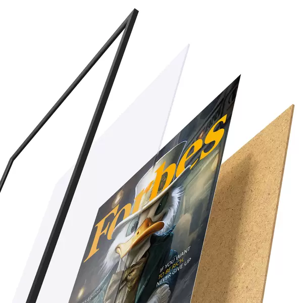 Plakatą sudaro rėmas, pleksiklas, atspausdintas vaizdas ir medžio drožlių plokštės pagrindas. Plakatą galima iš karto pakabinti ant sienos dėl kitoje pusėje esančių laikiklių.